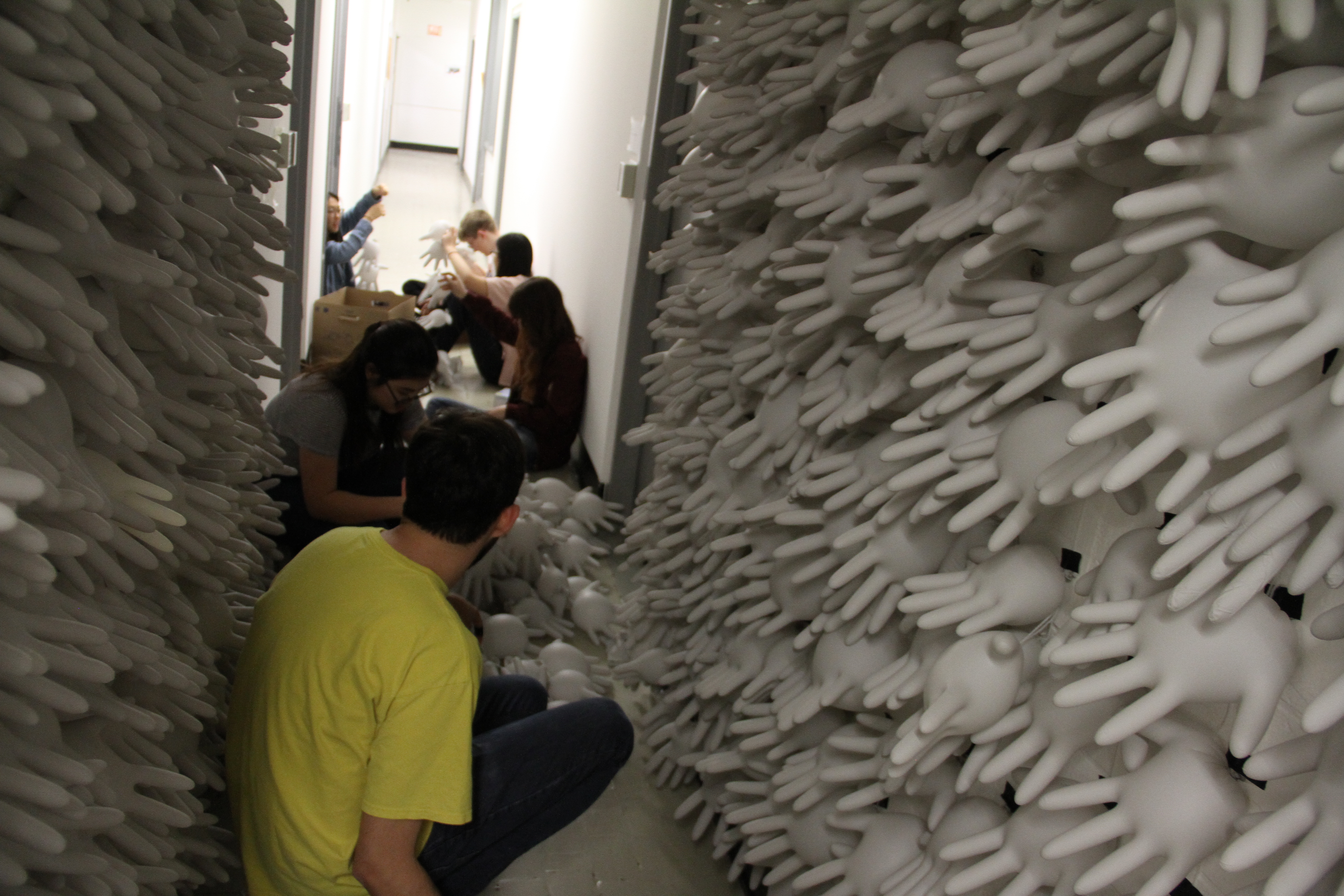 Below is the project entitled “Power in Numbers” where an experience was to be created using a lot of an every day object to create an impact. For this project roughly 600 nitrile gloves were inflated and placed sticking outward in a halway to create a claustrophobic experience with hands touching the viewer at all times.